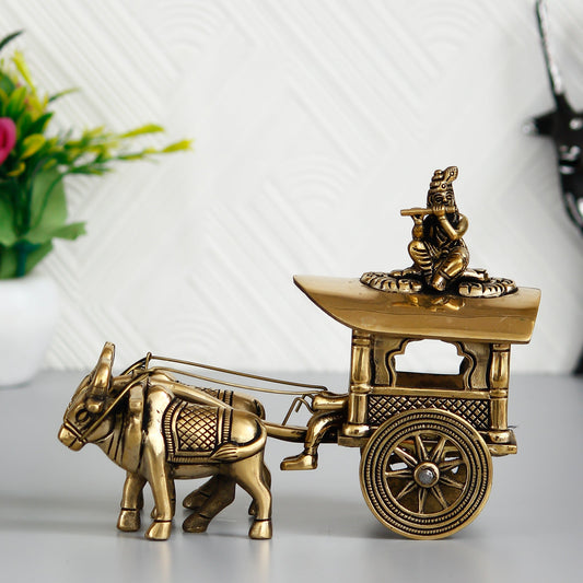 Golden Brass Lord Krishna Idol Sitting In Bullock Cart Showpiece