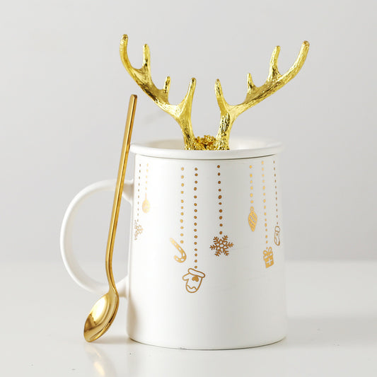 Nordic Couple Mug Porcelain Cup Golden Antlers Cover Home Spoon With Lid Milk Coffee Cup Drinking Glass Black White Ceramic Mug
