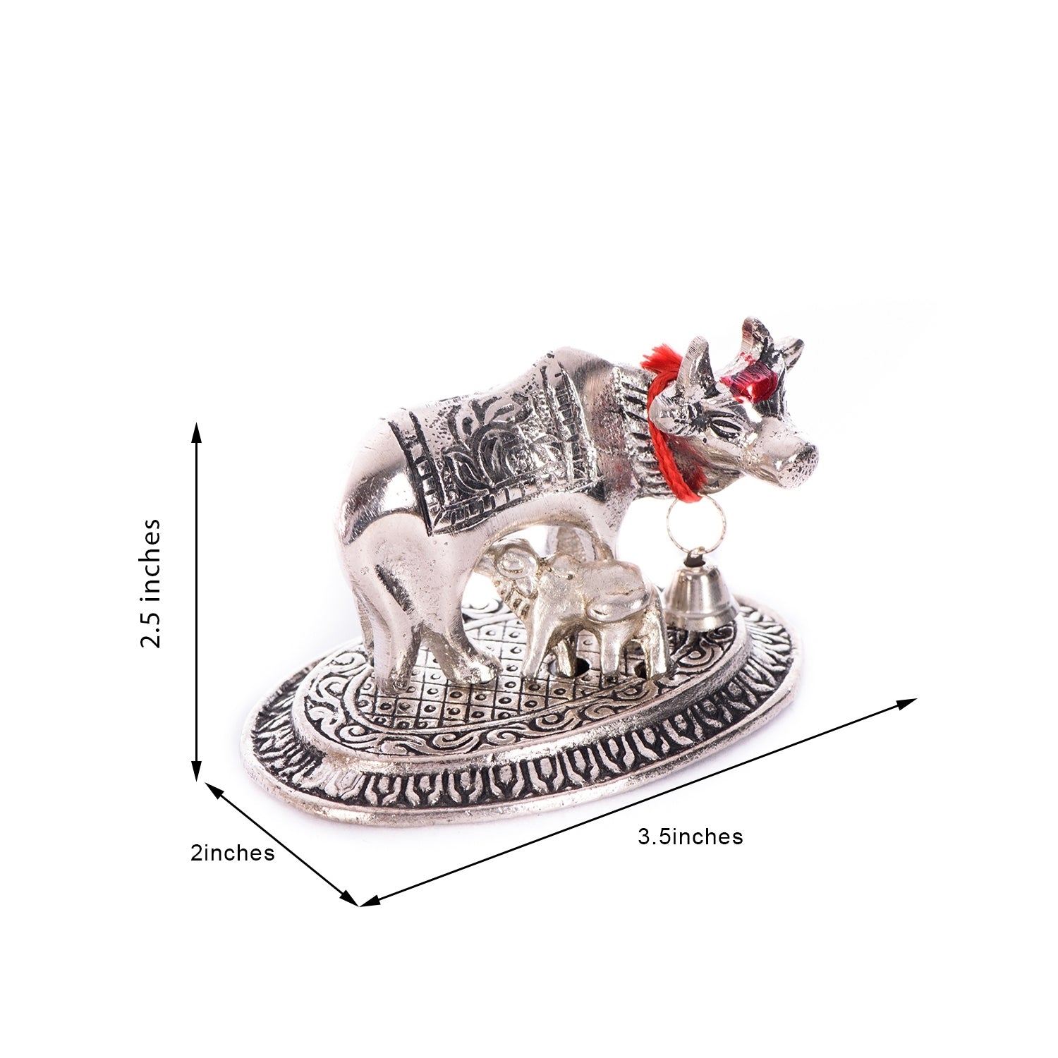 SKU Code - AAC499SBrand Name - eCraftIndiaSize (LxWxH) - 8Cm x 5Cm x 6Cm 3.5"x2"x2.5" Material - MetalCare Instruction - Don't wash, use drywet cotton cloth to remove dirt.Package Content - One Handcrafted Cow and Calf FigurineColor - SilverProduct Description - The unique creation of metal silver Kamdhenu cow & calf is an amazing symbol of holiness and culture that has been followed for years now. This figurine showcases the motherly figure of the cow that communicates the sentiments of people with Gaumata. These figurines are the most loved home decoration items that people adore to decorate their home with and also their puja ghar. This can also be a great gift option when you visit your relative's place for a religious function or even for a housewarming celebration. These creations are made by experienced artisans at the home of eCraftIndia using several antique methods.Kamdhenu cow & calf statues are widely used for decoration purposes in homes and offices. It is also a great gift for religious celebrations and festivities. Shop today!Kamdhenu cow & calf statues are widely used for decoration purposes in homes and offices. It is also a great gift for religious celebrations and festivities. Shop today!