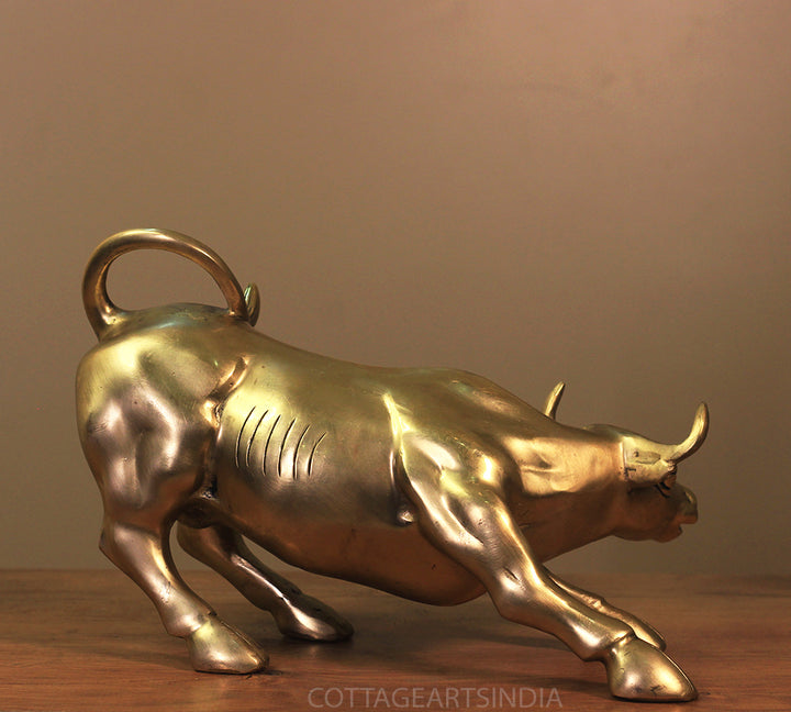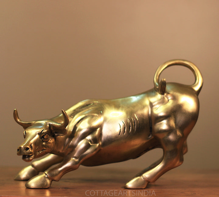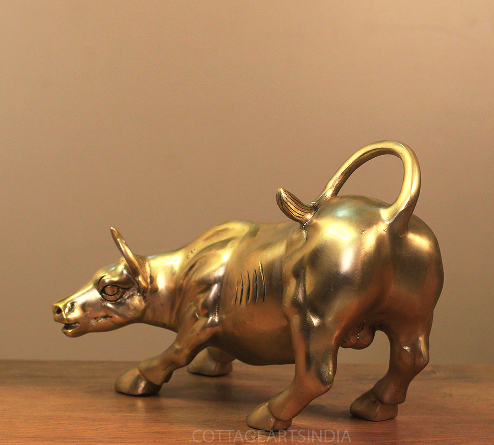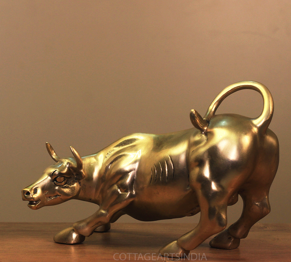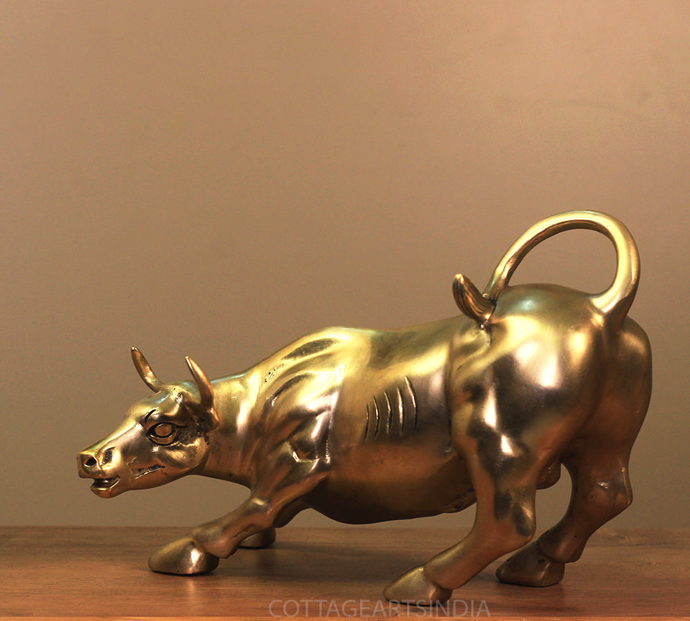 Dimensions9.5"x 7.5" x 6" ( Lenght x Width x Height ) inchesWeight4.150 KgMaterialSolid BrassProduct DescriptionBrass Bull in famous Wall Street USA posture of charging Bull. It depicts the symbol of properity and financial strengthInstructions For CareEnsure the lasting beauty of this idol with simple care gentle cleaning with a soft, dry cloth is recommended to preserve its divine radiance.. DO NOT use harsh chemicals to clean. You can apply a thin coat of any natural oil by gently rubbing it throughout the statue with a soft cloth in order to maintain its luster.Timelines for dispatch2-3 working days rom the receipt of order.Delivery Date5 to 7 days from date of dispatch . In case of urgent delivery please contact us on whatsapp.Disclaimer 1. Handcrafted products generally have slight imperfections, unmatched by mass production. Embrace the charm of handmade for authenticity and a connection to the artisan's skill.2. Any prop or accessories used for photography are not included with the product .Manufacturers and Retailers of Indian Handicrafts.Wall Decor | Table Decor | Brass Idols | Wooden Artware and MoreDimensions 9.5"x 7.5" x 6" ( Lenght x Width x Height ) inches Weight 4.150 Kg Material Solid Brass Product Description Brass Bull in famous Wall Street USA posture of charging Bull. It depicts the symbol of properity and financial strength Instructions For Care Ensure the lasting beauty of this idol with simple careDimensions 9.5"x 7.5" x 6" ( Lenght x Width x Height ) inches Weight 4.150 Kg Material Solid Brass Product Description Brass Bull in famous Wall Street USA posture of charging Bull. It depicts the symbol of properity and financial strength Instructions For Care Ensure the lasting beauty of this idol with simple care